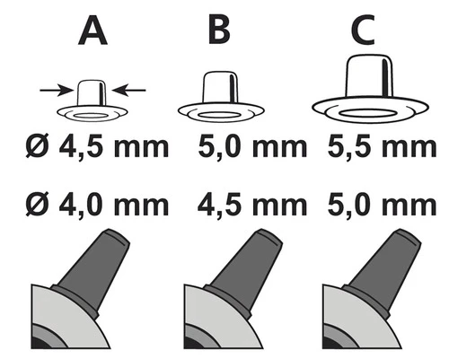 Pons- en nesteltang met ponsen in de maten 4,5 – 5 en 5,5 mm en drukinrichting voor A-, B- en C-ogen