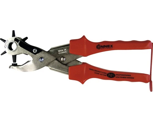 Zeer stevige ponstang, 70 % krachtbesparing door hefboomeffect, 6 ponsen in de maten: 2 – 2,5 – 3 – 3,5 – 4 en 4,5 mm, voor het perforeren van leder, karton, enz.