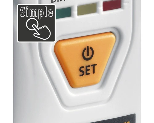 De vochtigheid van het materiaal wordt in het display in % aangegeven. Naast de numerieke weergave van de meetwaarden wordt het meetresultaat middels een Nat-/Droog-LED-indicator aangegeven. Drie gekleurde LEDs informeren je of het gemeten materiaal als droog (groen), vochtig (geel) of nat (rood) moet worden geclassificeerd.