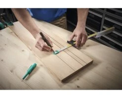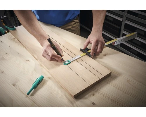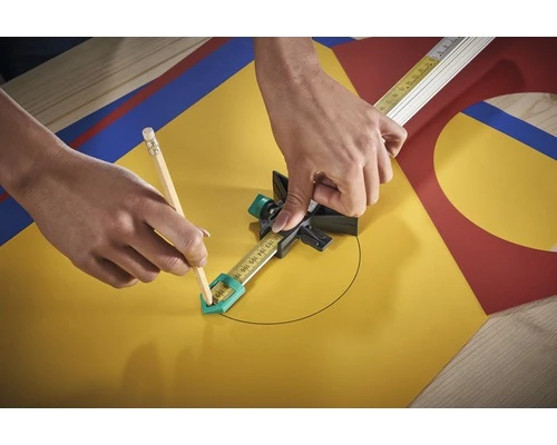 Deze 2-delige set transformeert uw duimstok in een solide kruishout in slechts een paar stappen. Eenvoudig op de duimstok schuiven, stel de maat in, plaats de aanslag stevig op de rand van het werkstuk en teken veilig geleide parallelle lijnen met een potlood. De geïntegreerde centreerpin voor de passerfunctie maakt het ook mogelijk om exacte cirkelvormen te tekenen. Het kruishout is gemaakt van hoogwaardig kunststof – een duurzame en solide helper voor vele toepassingsgebieden.
